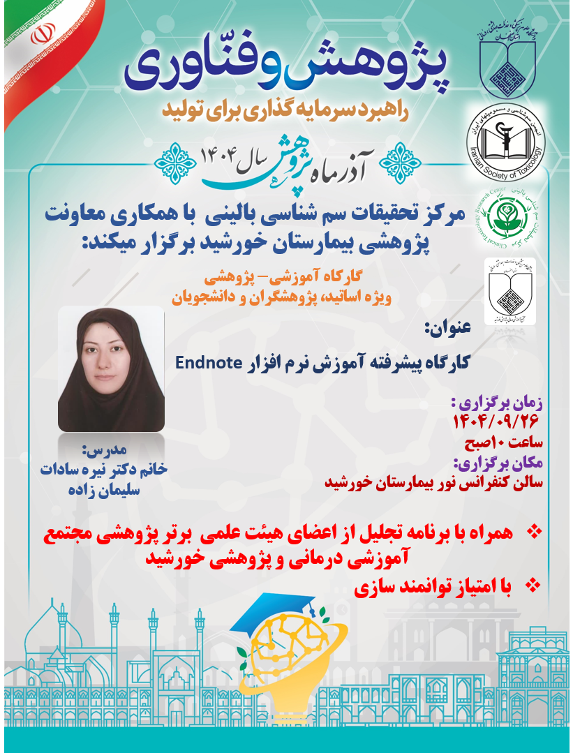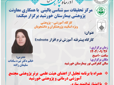 - کارگاه پیشرفته نرم افزار Endnote مورخ 1404/09/26 در سالن کنفرانس نور بیمارستان خورشید با سخنرانی خانم دکتر نیره سادات سلیمان زاده برگزار میگردد.
