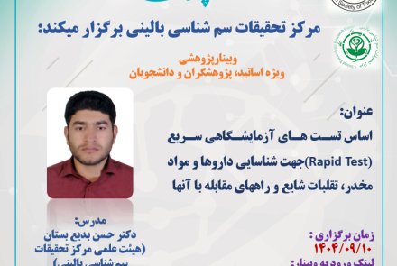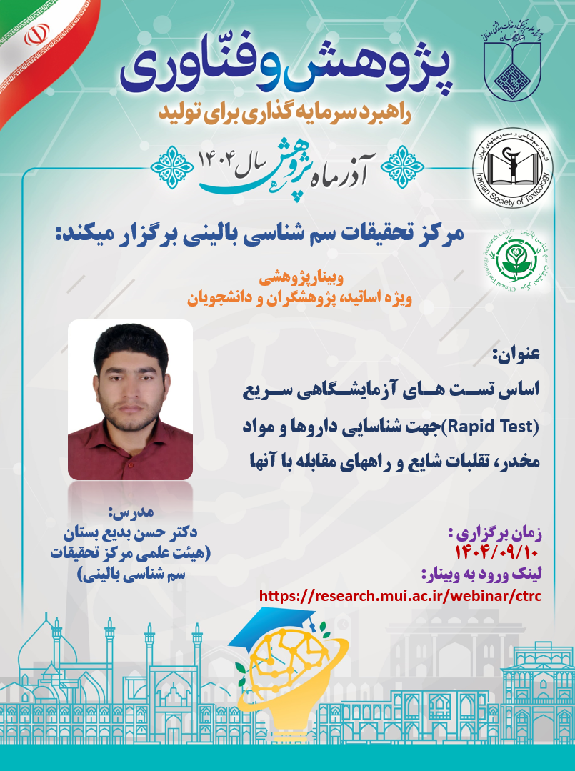 وبینار آموزشی اساس تست های آزمایشگاهی سریع (rapid test) جهت شناسایی داروها و مواد مخدر، تقلبات شایع و راههای مقابله با آنها مورخ 1404/09/10 توسط آقای دکتر حسن بدیع بستان با لینک https://research.mui.ac.ir/webinar/ctrc برگزار میگردد.