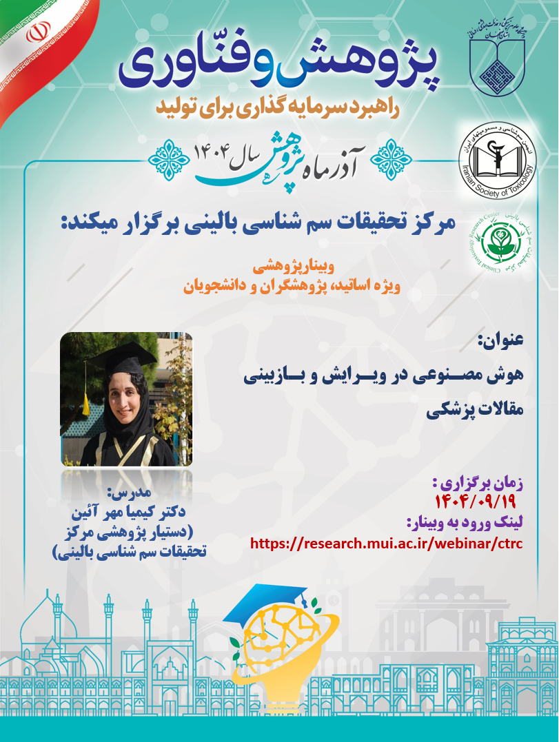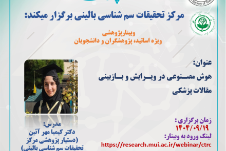 وبینار آموزشی هوش مصنوعی در ویرایش و بازبینی مقالات پزشکی مورخ 1404/09/19 توسط خانم دکتر کیمیا مهر آئین با لینک https://research.mui.ac.ir/webinar/ctrc برگزار میگردد.